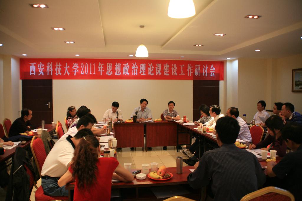 党委副书记甘安生主持会议并作了《加强教师队伍建设 全面提升思想政治理论课建设水平》的主题报告,从组织管理、教学管理、队伍管理、学科建设等方面就学校一年来思想政治理论课建设情况进行了回顾,从加强学习,认真领会上级有关会议和文件精神,把思政课建设标准落到实处;积极推进教学方法改革创新,积极深化社会主义核心价值体系、马克思主义中国化的最新成果的“三进”工作,进一步增强思想政治理论课的针对性、实效性和感染力;把教师队伍建设摆在更加突出的位置,全面提高思政课教师的政治素质和业务素质;切实加强科研工作和学科内涵建设,推动思政课教学与学科建设再上新台阶等四方面对当前和今后一段时期思政课建设的主要任务进行了安排部署。会上,与会人员认真学习了教育部印发的《高等学校思想政治理论课建设标准(暂行)》文件精神,并就各项建设指标等内容进行了热烈的讨论。