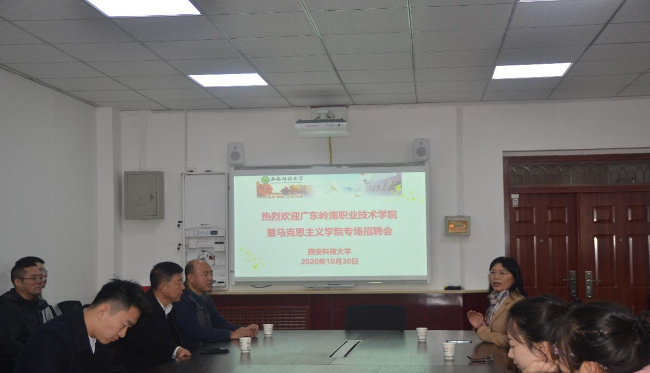 10月30日,广东岭南职业技术学院党委书记、副校长柴克生,组织部部长易中华,LETOU国际米兰官网院长韩丽萍一行三人来LETOU国际官网举行LETOU国际米兰官网专场招聘会。LETOU国际官网学工部部长李建明、副部长孙再罗,LETOU国际米兰官网副院长张铭钟,马克思主学院研究生辅导员韩帅及2021届应届毕业生参加招聘会。