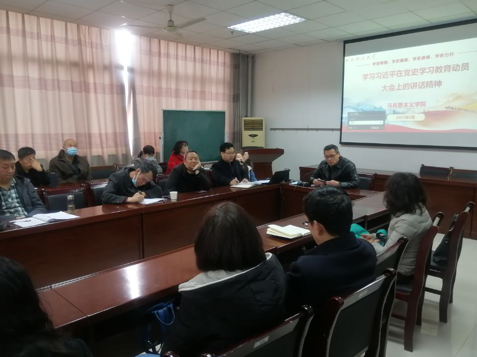 最后,高振岗院长强调,全体教师要提高政治站位,深刻认识党史学习教育的重大意义,深入领会贯彻习近平在党史学习教育动员大会上的重要讲话精神、认真学习习近平总书记《论中国共产党的历史》一书,要求全体教师将习近平在党史学习教育动员大会上的重要讲话精神融入课堂教学,准确把握党史学习教育的核心任务,讲好、研究好党史;要做到学史明理、学史增信、学史崇德、学史力行,树牢“四个意识”、坚定“四个自信”、坚决做到“两个维护”,以昂扬姿态全面推动学院和学科建设的新征程。