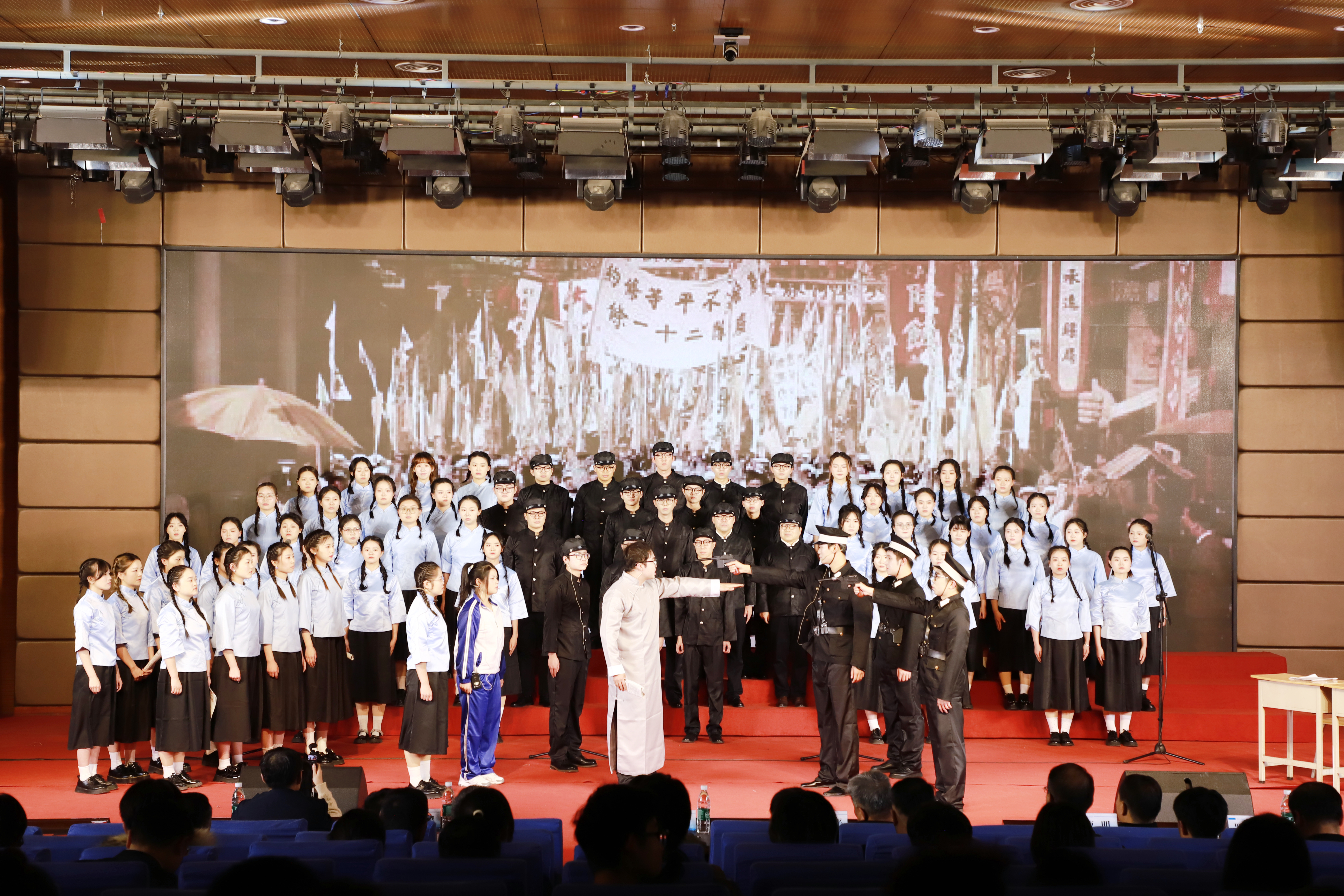 比赛现场,学院参赛队伍身着整齐服装,精神饱满、意气风发。伴随着李超老师利落的弧形起拍,旋律缓缓响起,钢琴和弦沉稳大气,小提琴伴奏清丽婉转。《LETOU国际米兰官网之歌》旋律激昂,“我们励志图存、自强不息”的歌词在报告厅回荡;情景剧生动再现了五四运动爱国青年为民族独立与解放挺身而出的英勇场景,彰显了“国家有难,匹夫有责”的赤诚担当;《追寻》旋律悠扬,歌声中饱含对革命先辈的敬仰与对理想信念的执着追求。嘹亮的歌声、真挚的情感赢得现场评委与观众的阵阵掌声。
