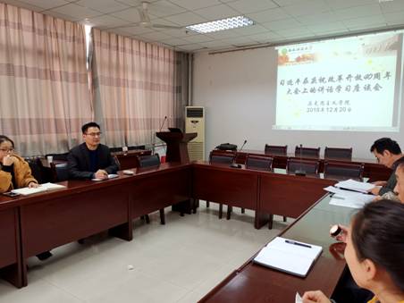 会上,首先由学院党委书记袁金群全文领学了习近平总书记在庆祝改革开放40周年大会内容,并就讲话内容进行深入解读,分析了改革开放40年来我国的发展变化。然后,院长高振岗谈了自己对习近平总书记重要讲话精神的学习心得,并提出要将讲话精神融入到本科和研究生思政课课堂的方案,提出要组建“全国教育大会暨习近平总书记在庆祝改革开放40周年讲话精神宣讲团”,为全校本科生及其他院系的研究生进行宣讲。与会的博士、硕士研究生代表也谈了自己的学习心得体会,表示要将讲话精神与学习、科研结合起来,不断提高学术研究水平。