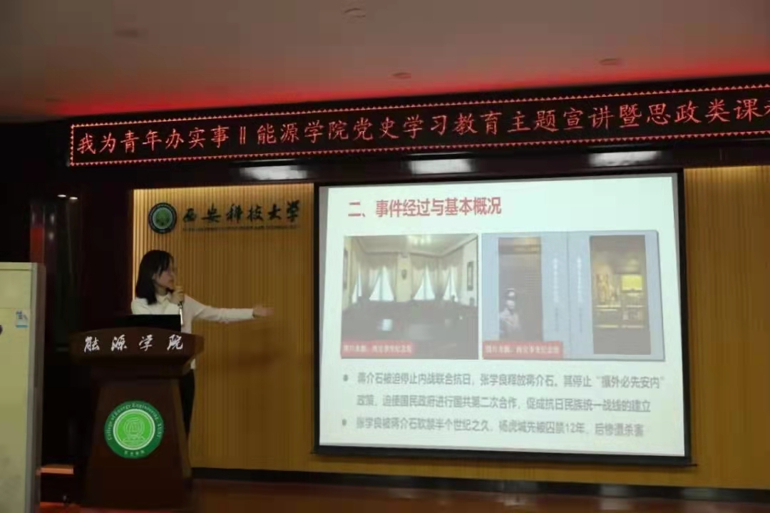 权颖庆以“西安事变”为题,讲述了西安事变发生的背景、经过及影响,展现了中国共产党深刻把握历史发展规律和大势、以民族大义为重的博大胸襟,倡导青年学生将爱国热情转化为爱国实践,始终保持昂扬向上的精神状态,努力学习、矢志不渝、敢于担当,报效祖国。