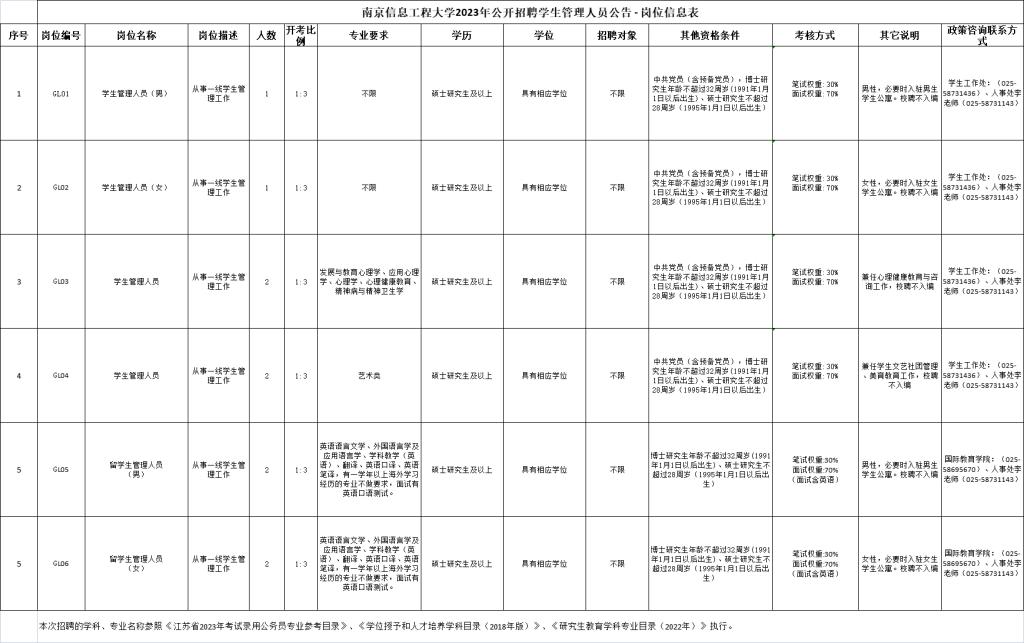 应聘学生管理人员(GL01-GL04):学工处顾老师025-58731436;