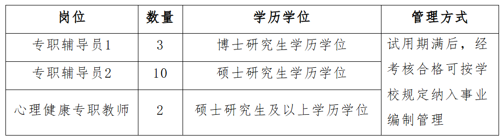根据学校辅导员队伍建设需求,经学校研究决定,面向社会公开招聘专职辅导员和心理健康专职教师,现将有关事项公告如下: