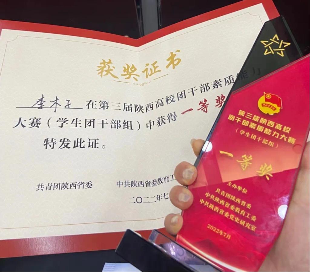 7月2日,由共青团陕西省委、中共陕西省委教育工委、中共陕西省委党史研究室主办的第三届陕西高校团干部素质能力大赛决赛在西北工业大学友谊校区举行。学院2021级硕士研究生团支部书记李木子过关斩将,在672件作品中以优异的成绩进入复赛,经过现场微团课讲授、案例分析等环节后,荣获学生团干部组一等奖。